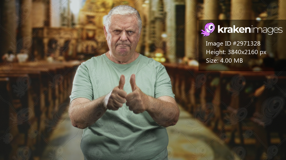 Senior man showing two thumbs up with visible hands and stern frown while standing among pews in an ornate church building; stoic defiance.