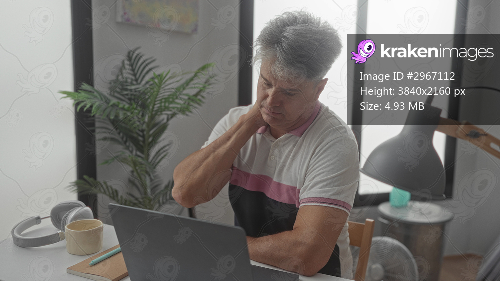 Senior man sitting at desk holding neck beside laptop, mug, headphones and desk lamp in building; discomfort stress.
