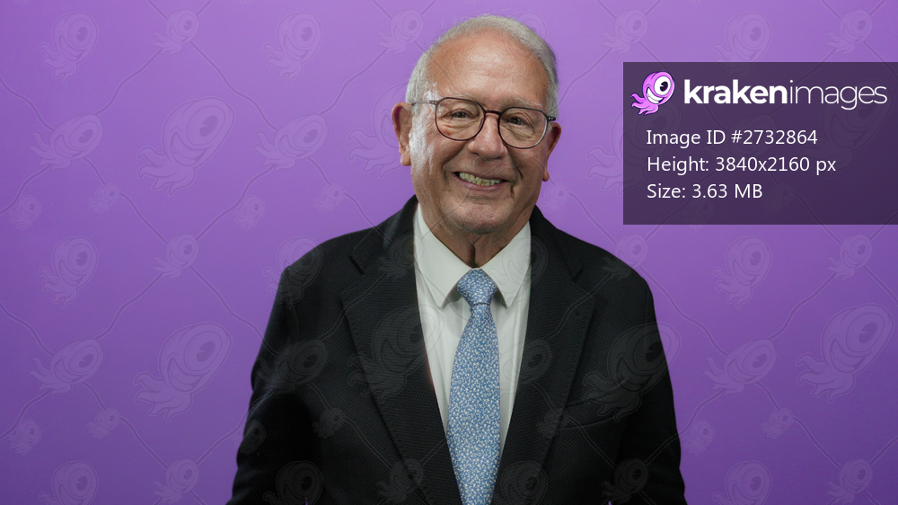 Senior man smiling in business suit against isolated purple background expressing various emotions with a pleasant demeanor, embodying confidence and positive energy. - Kraken Images