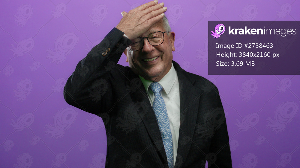 Senior man smiling in business suit against isolated purple background expressing various emotions with a pleasant demeanor, embodying confidence and positive energy. - Kraken Images