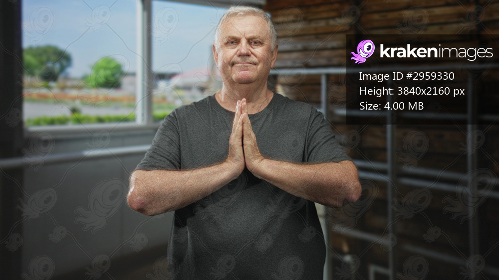 Senior man stands with palms pressed together in prayer gesture in a studio by a window and wooden wall, wearing a grey tshirt; calm reflection.
