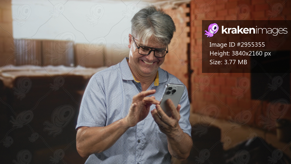 Senior man tapping smartphone with bare hands, smiling and looking at screen in a brick building interior with stacked furniture visible; contentment.