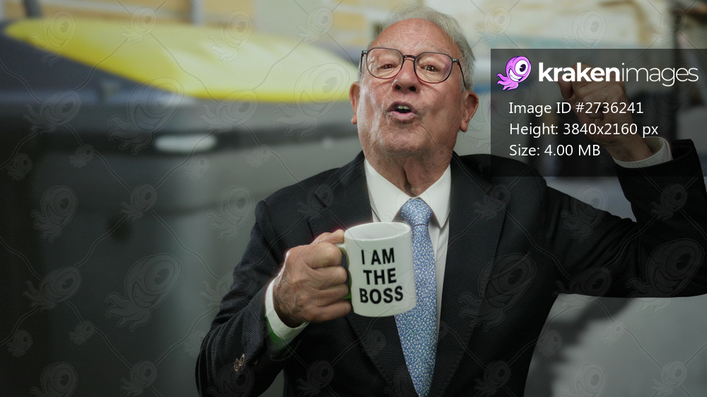Senior man wearing a business suit holds a motivational mug confidently outdoors on a vibrant city street.