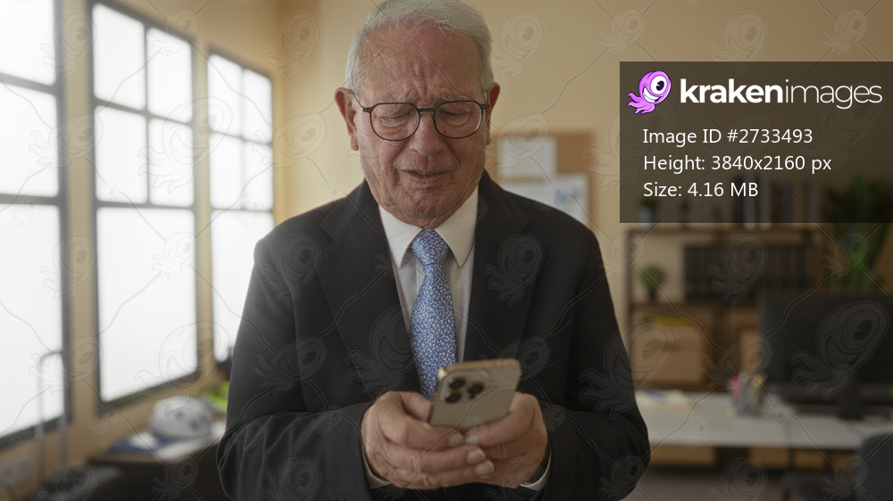 Senior man wearing a business suit looks at his phone in a modern office environment with a concerned expression, indicating possible work-related stress or digital communication issues. - Kraken Images