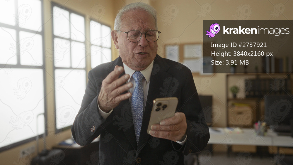 Senior man wearing a business suit looks at his phone in a modern office environment with a concerned expression, indicating possible work-related stress or digital communication issues. - Kraken Images