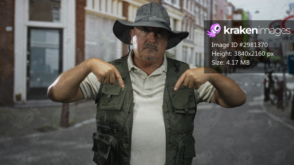 Senior man wearing a fishing vest and wide brim hat points fingers at vest pockets on a narrow street beside bicycles and storefront buildings; pride solitude. - Kraken Images