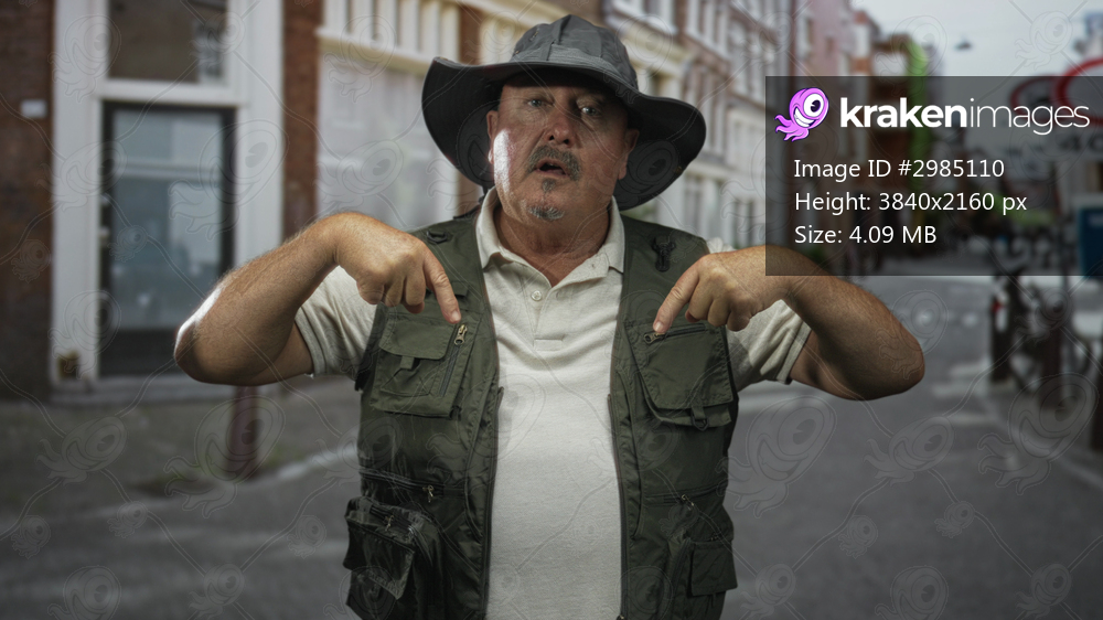 Senior man wearing a fishing vest and wide brim hat points fingers at vest pockets on a narrow street beside bicycles and storefront buildings; pride solitude. - Kraken Images