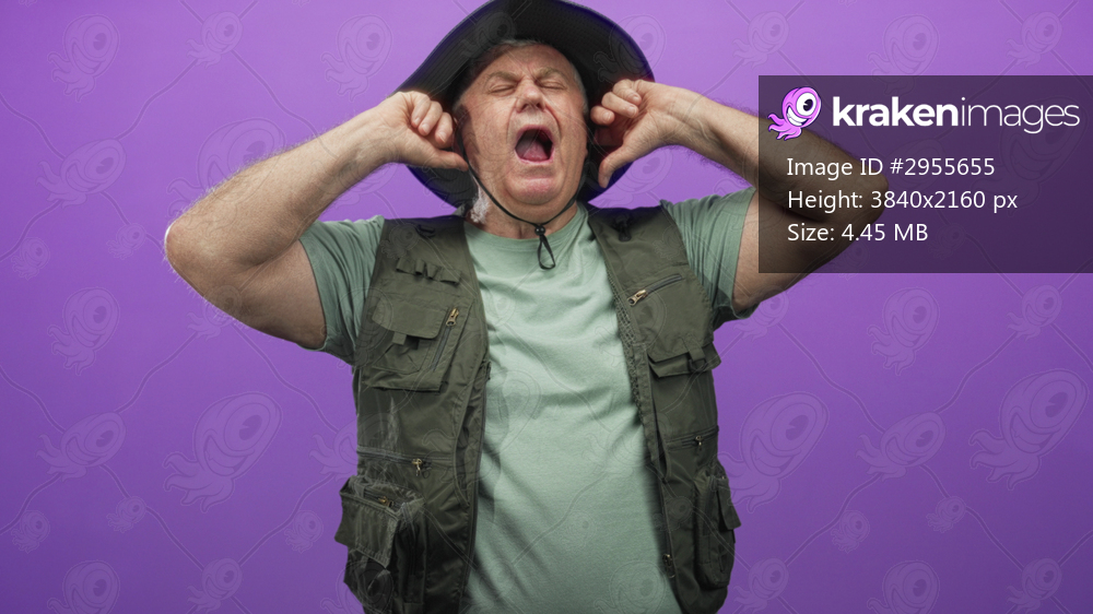 Senior man wearing bucket hat and fishing vest plugs ears with fingers, mouth open and eyes closed against purple studio backdrop; discomfort.