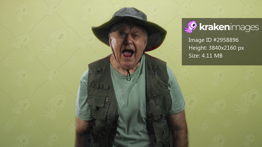 Senior man wearing fishing vest and wide brim hat with chinstrap, mouth open shouting in studio against green backdrop; frustration resilience.