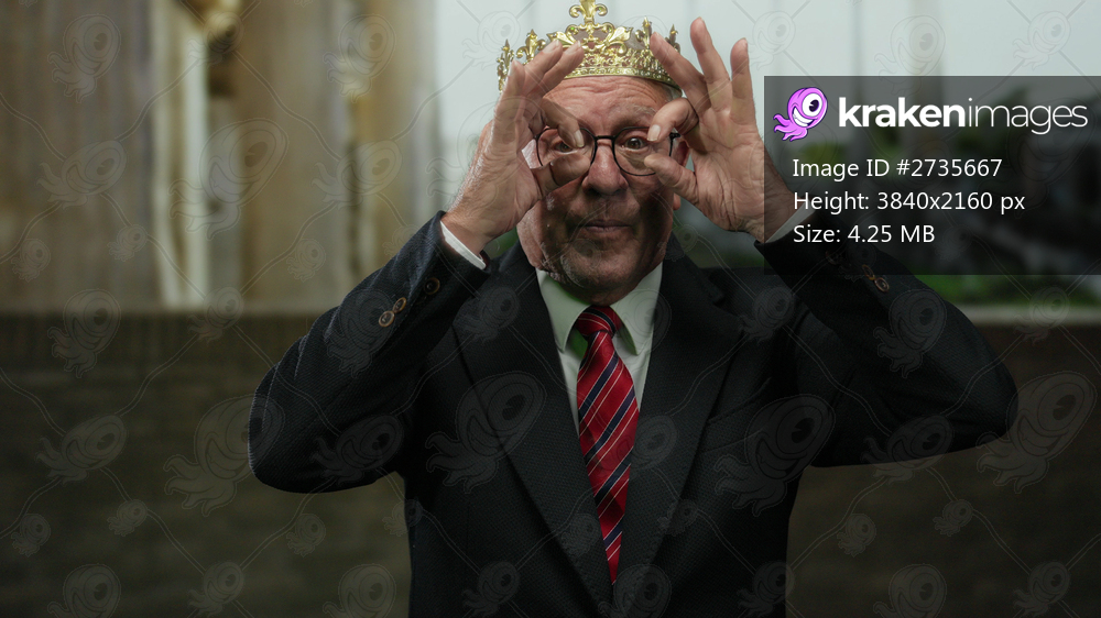 Senior man wearing suit and crown playfully mimics eyeglasses gesture on a street with a blurred background.