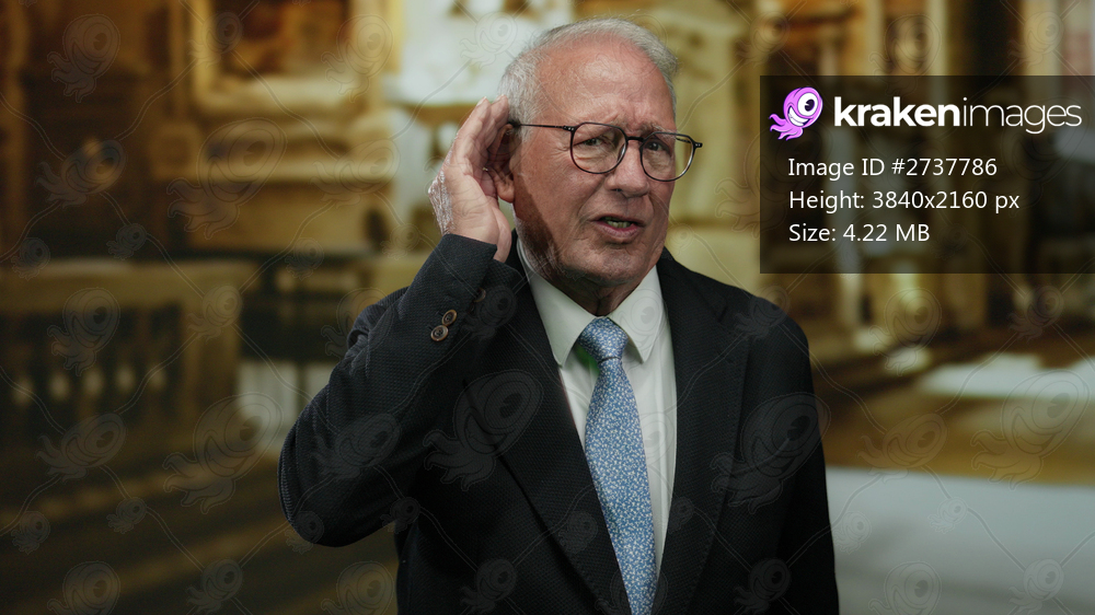 Senior man wearing suit in church environment appearing to listen intently with focus on expression, showcasing a businesslike demeanor indoors.