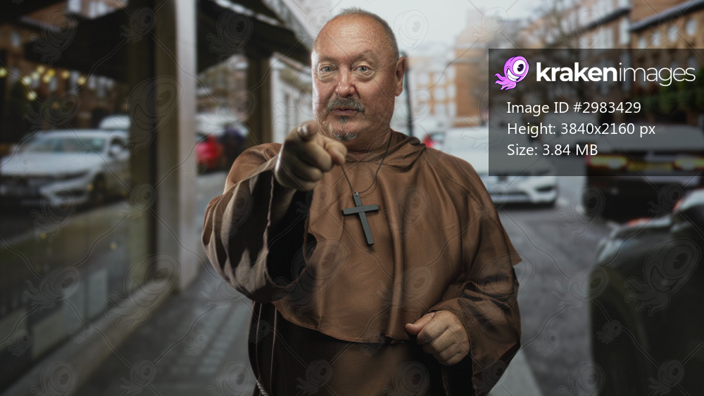 Senior monk man points finger wearing cross necklace on city street with cars and storefronts; faith authority.