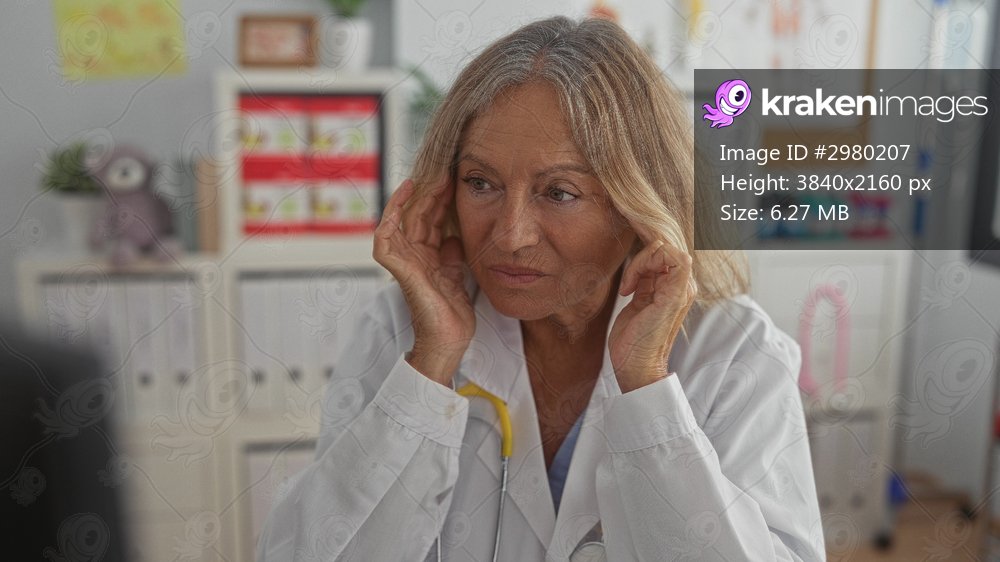 Senior pediatrician woman presses temples with hands while seated at desk in clinic; compassion fatigue.