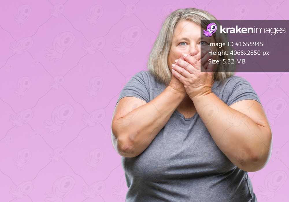 Senior plus size caucasian woman over isolated background shocked covering mouth with hands for mistake. Secret concept.