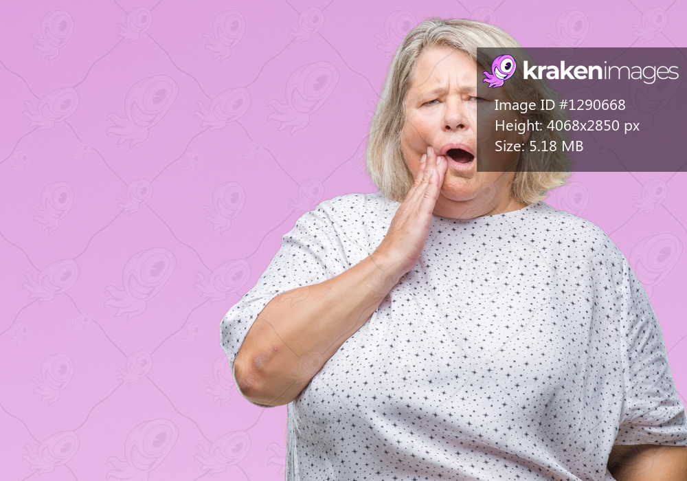 Senior plus size caucasian woman over isolated background touching mouth with hand with painful expression because of toothache or dental illness on teeth. Dentist concept. - Kraken Images