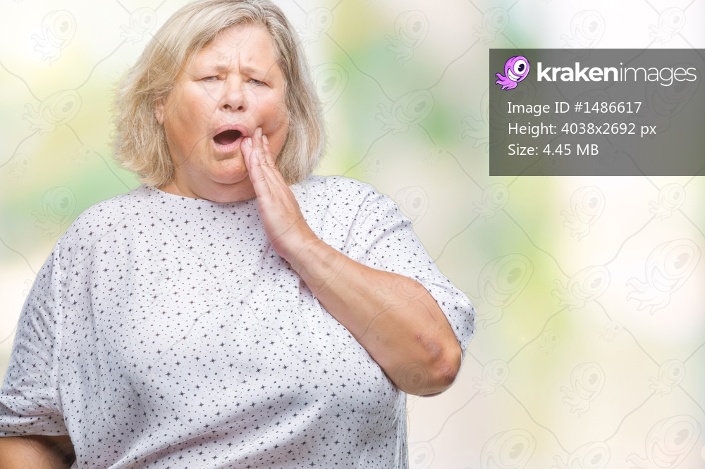 Senior plus size caucasian woman over isolated background touching mouth with hand with painful expression because of toothache or dental illness on teeth. Dentist concept. - Kraken Images