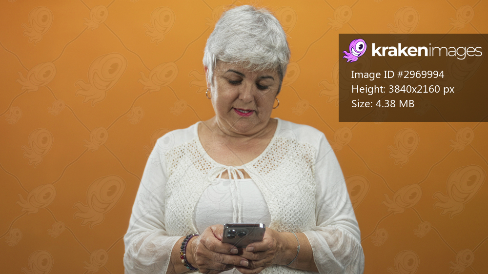 Senior plus size woman with grey hair holding smartphone and typing with both hands while looking down in studio; calm reflection.