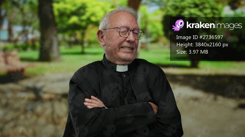Senior priest in black clerical attire with arms crossed smiles outdoors in a green park setting on a sunny day.