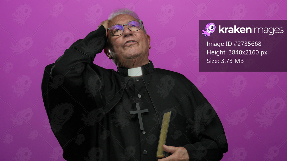 Senior priest in black robe, holding a book, stands over an isolated pink background with a thoughtful expression, highlighting faith and contemplation. - Kraken Images
