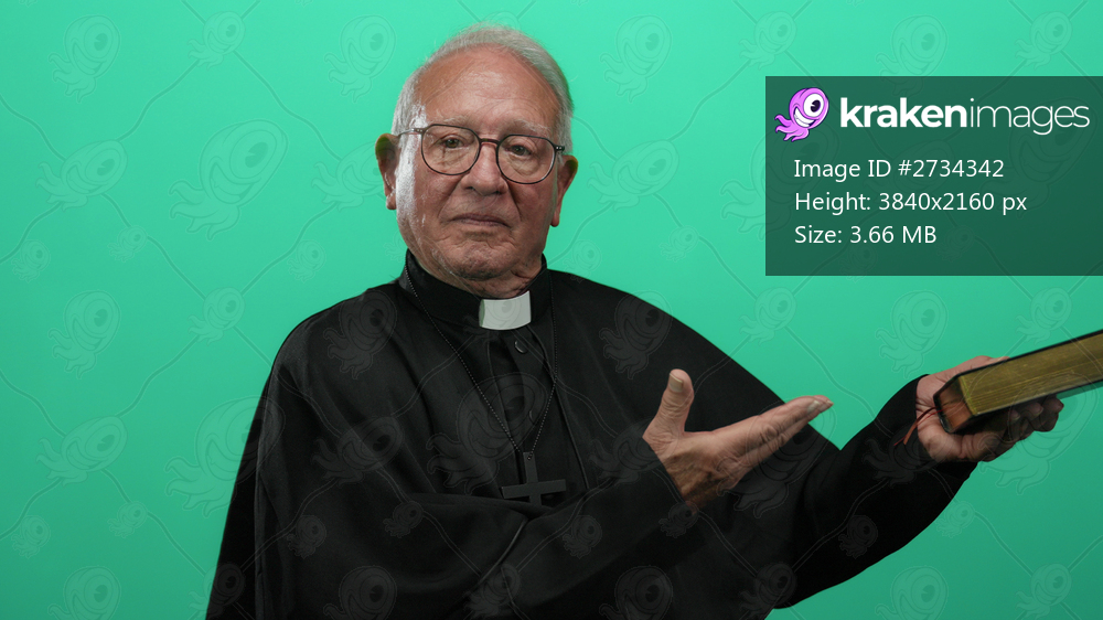 Senior priest in black robe holds book against green background, looking contemplative with glasses and cross necklace, emphasizing religious theme and wisdom. - Kraken Images