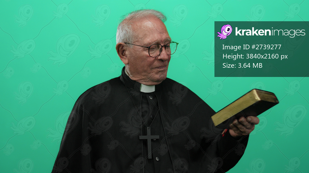 Senior priest in black robe holds book against green background, looking contemplative with glasses and cross necklace, emphasizing religious theme and wisdom. - Kraken Images