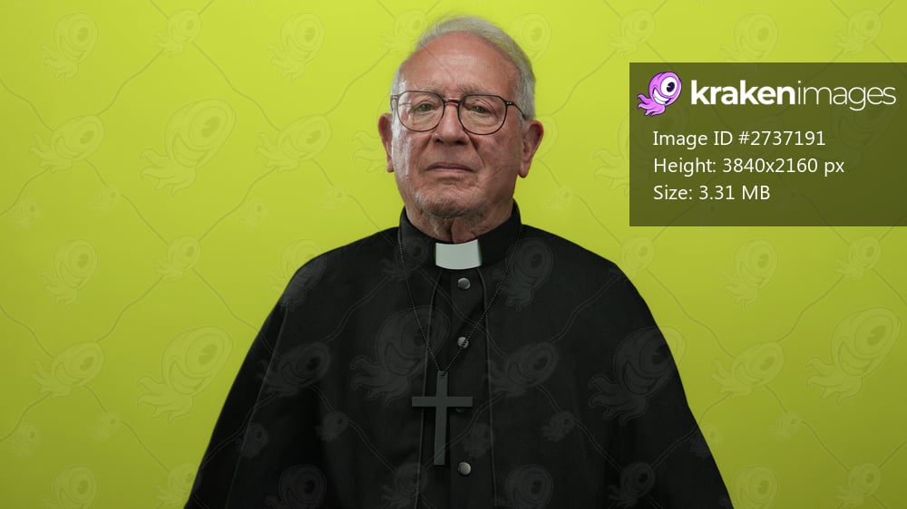 Senior priest in black robe making thumbs down gesture against a vibrant yellow background, conveying disapproval with a serious expression.