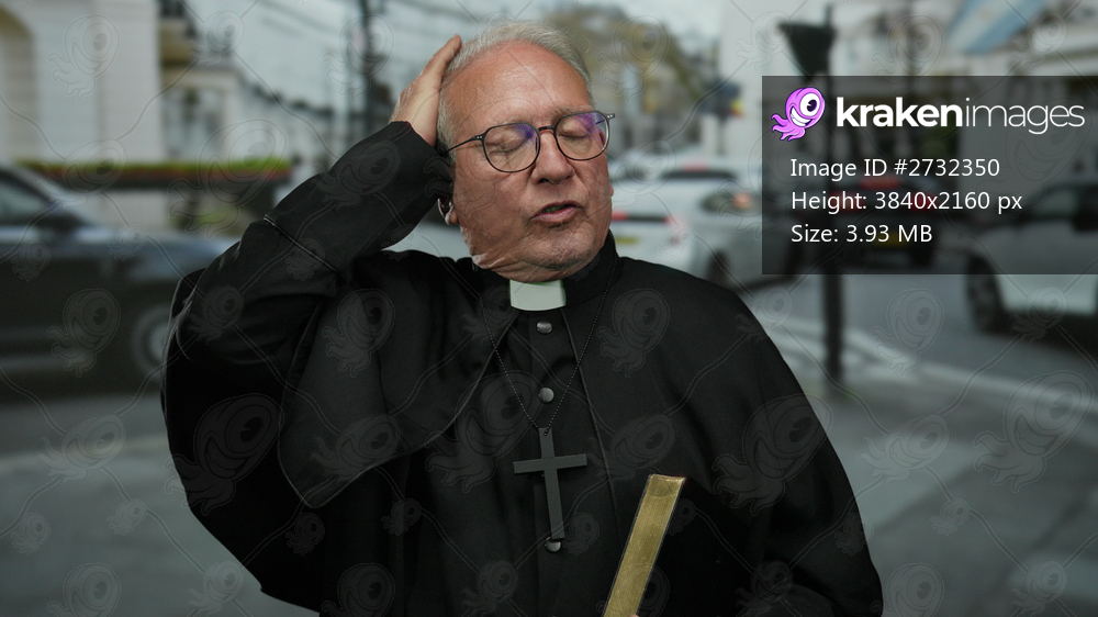 Senior priest man holding a book in a busy street setting while expressing contemplation with vehicles and buildings in the background.