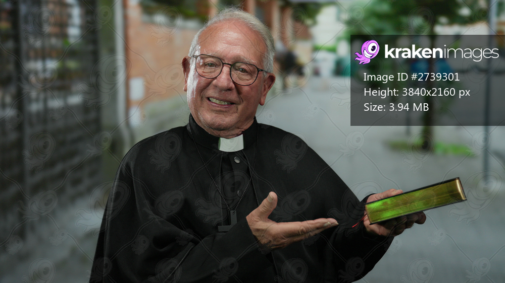 Senior priest man in black robe holding bible on street outdoors with a cheerful expression and inviting gesture in urban environment during daytime