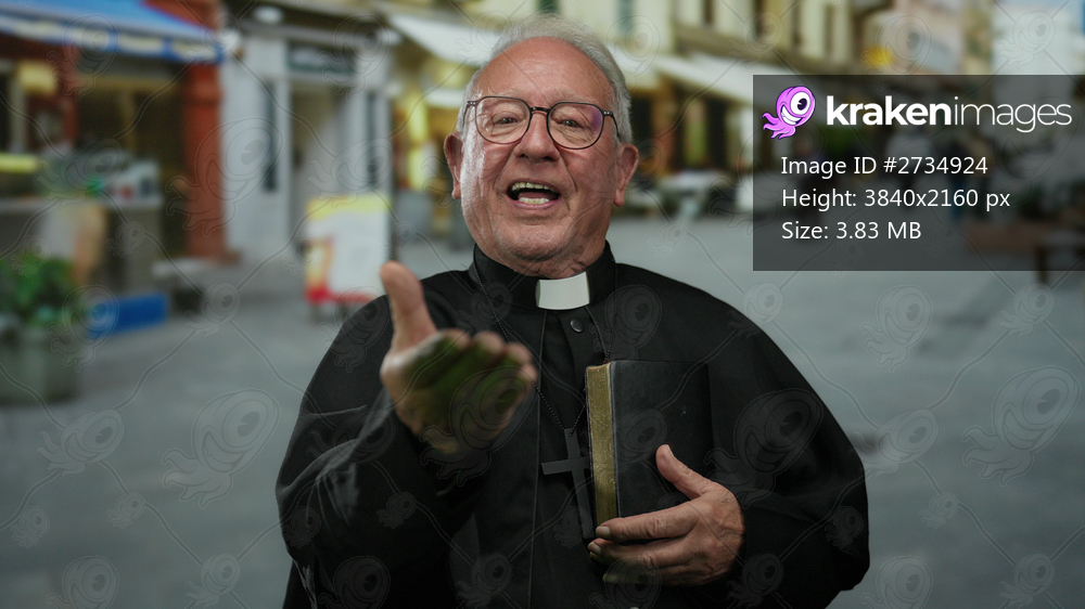 Senior priest man in street gesturing while holding book in outdoor urban setting, showcasing religious faith and tradition in a vibrant city environment. - Kraken Images