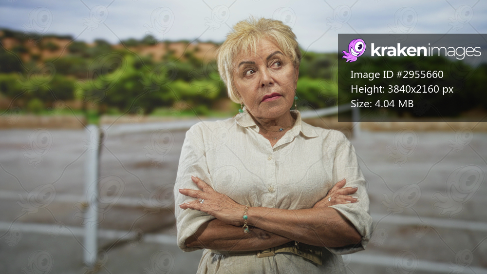 Senior woman with arms crossed and a sideways glance at a railing on a street; quiet skepticism reserve.