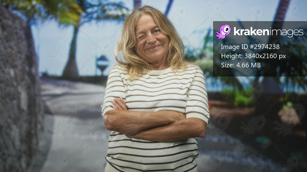 Senior woman with arms crossed, bare forearms and striped sweater smiling against a projected beach backdrop in a studio; confidence.