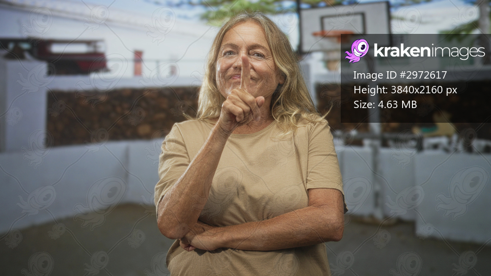 Senior woman with arms crossed beside a basketball hoop in a building courtyard; confidence resilience wisdom.
