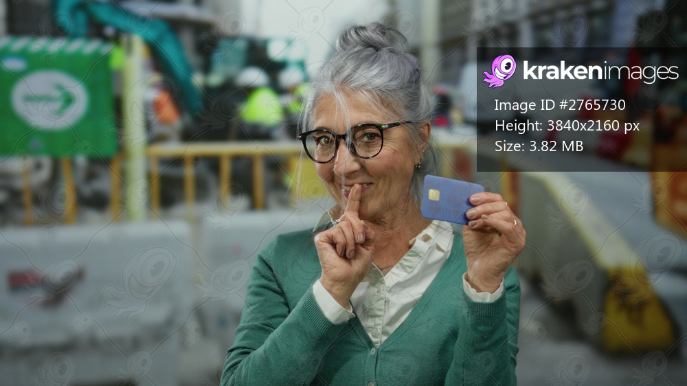 Senior woman at construction site holding credit card making silence gesture with grey hair glasses green sweater outdoor busy urban.