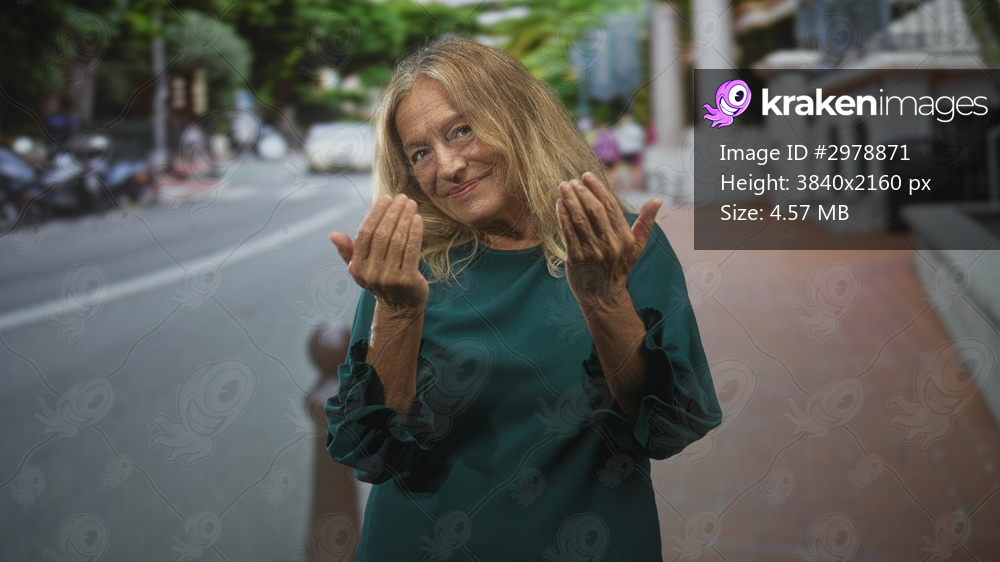 Senior woman with blonde hair beckons with both hands and visible fingers on a city street near building facades, smiling and tilting head; warmth.