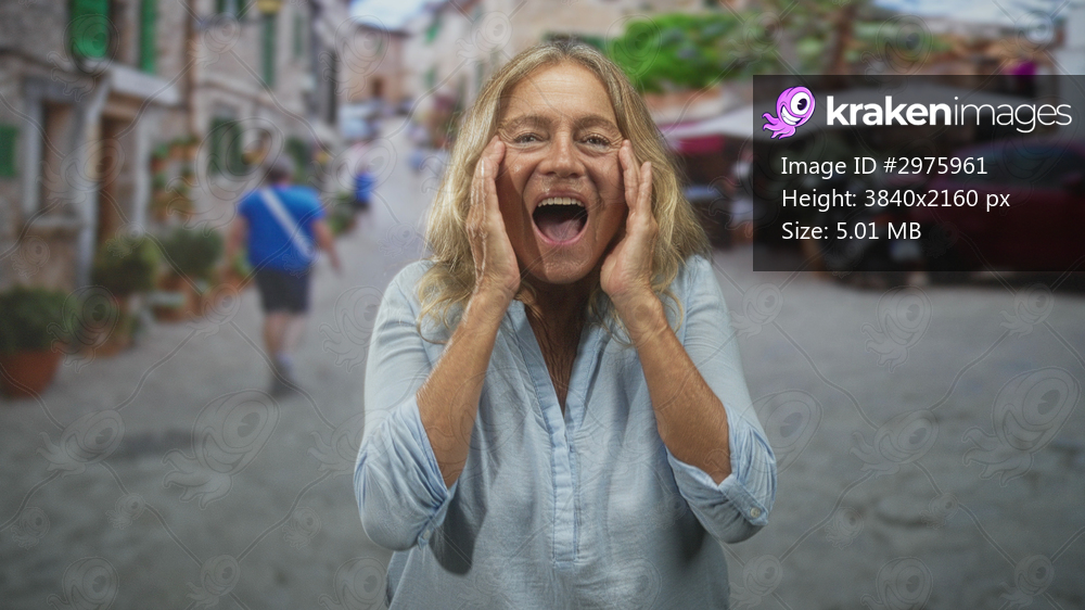 Senior woman with blonde hair clasping hands to her chest and smiling with eyes closed on a cobbled street with cafe tables and potted plants; joy.