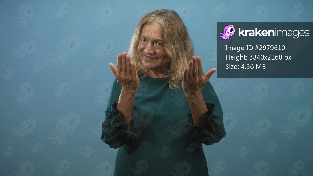Senior woman with blonde hair in teal dress giving double thumbs up, beckoning with palms and clapping hands against solid blue studio backdrop; approval. - Kraken Images