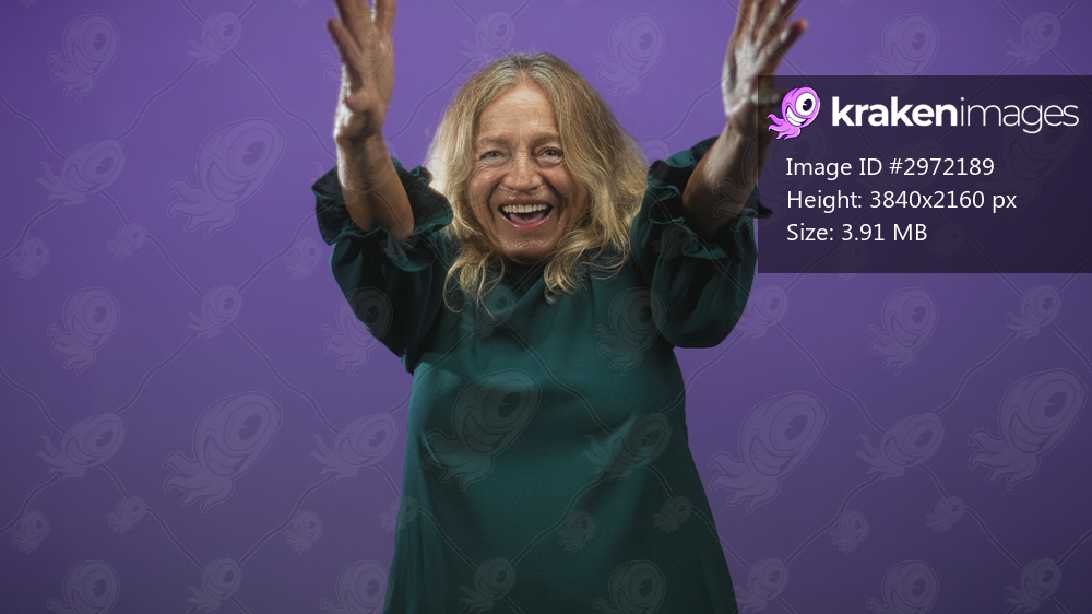 Senior woman with blonde hair laughing, hands to head then stretching arms forward and giving double thumbs up while wearing a green dress in a studio with purple backdrop; joy celebration. - Kraken Images