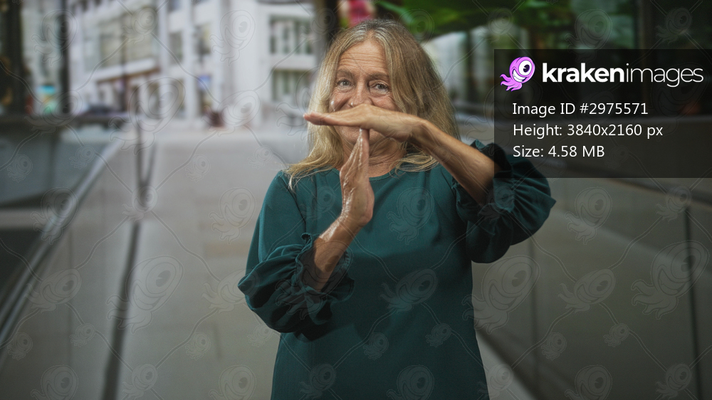 Senior woman with blonde hair making time out gesture with hands near face and visible palm in front of modern building entrance; determination.
