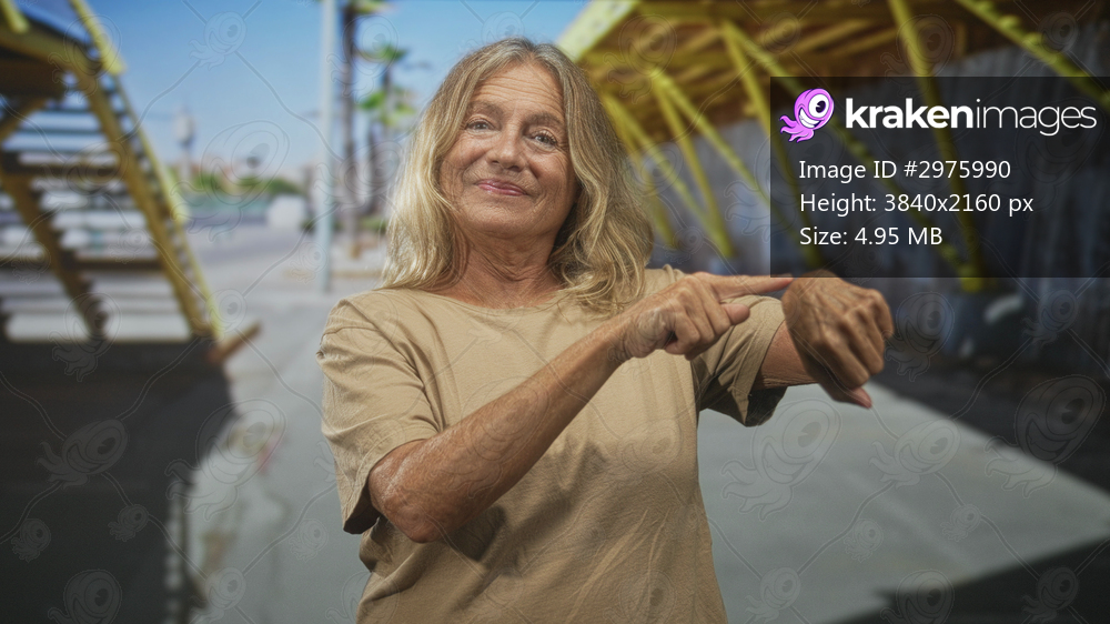 Senior woman with blonde hair pointing to her wrist as if checking the time on a sunny street under a pier boardwalk with visible stairs and palms; playful reminder. - Kraken Images