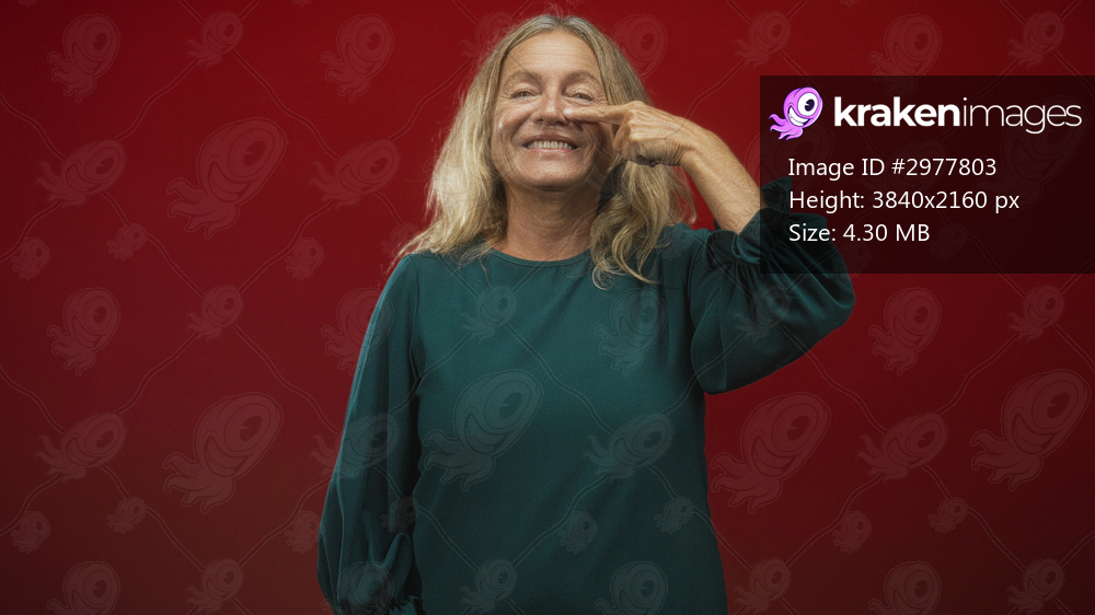 Senior woman with blonde hair points finger to nose, smiling, wearing green blouse against red studio backdrop; playful confidence.