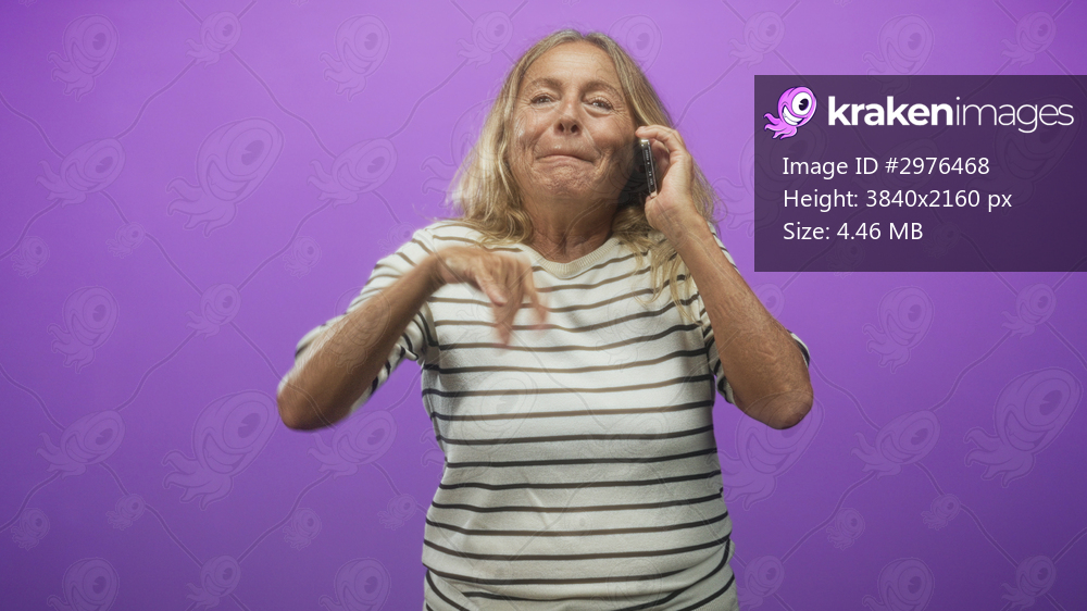 Senior woman with blonde hair and striped shirt holds mobile phone to ear while making shaka hand gesture and smiling in studio; playful joy.