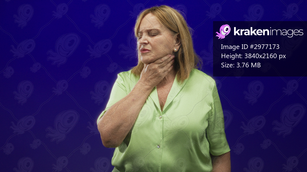 Senior woman with blonde hair touching her throat with both hands in a blue studio while wincing; health concern.