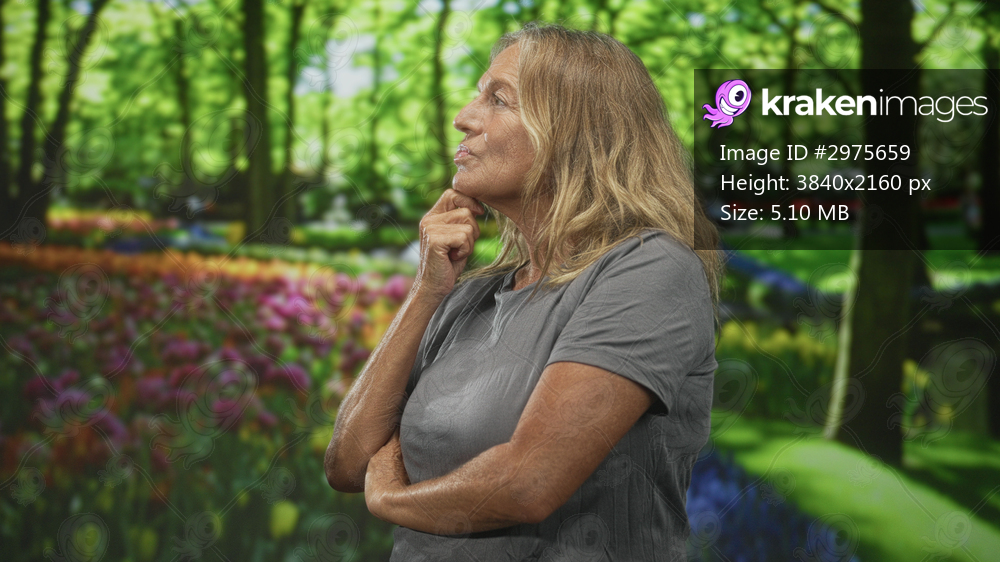 Senior woman blonde with hand on chin in a tulip field forest, side profile and crossed arm posture; contemplation.