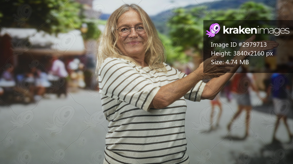 Senior woman blonde in striped shirt presenting with outstretched hands on a busy pedestrian street market, smiling; friendly welcome.