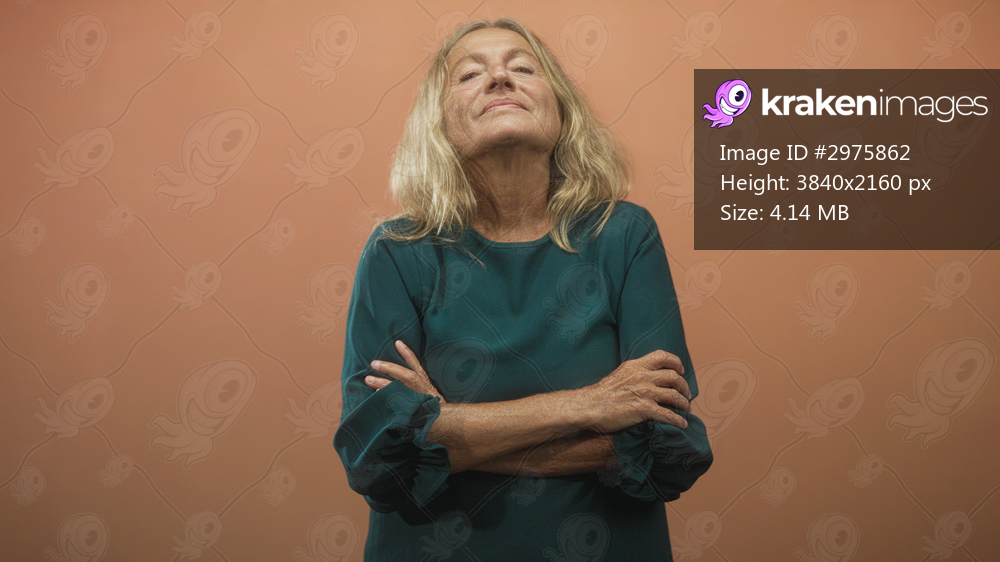 Senior woman, blonde, wearing teal green dress, arms crossed showing forearms and hands, slight head tilt and warm smile, studio setting; quiet confidence.
