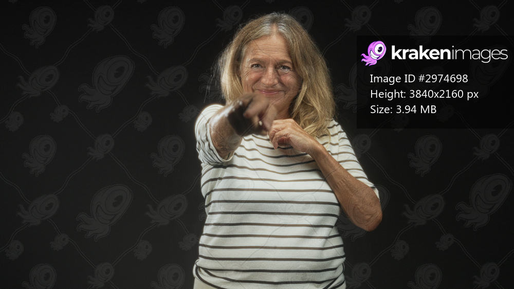 Senior woman blows a kiss with her hand, forms a heart with both hands and points a finger toward viewer in studio; affection playfulness.