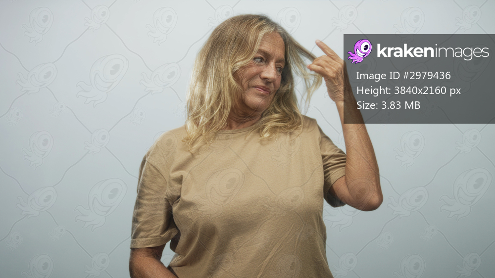 Senior woman brushing hair and touching her face with hands, eyes closed and subtle expression, standing against a plain studio backdrop; introspection calm. - Kraken Images