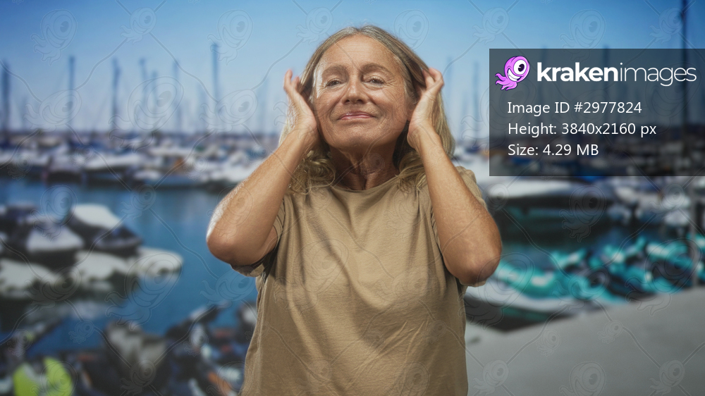 Senior woman brushing long blonde hair with both hands and smiling with eyes closed at a marina filled with moored yachts and piers; serenity.