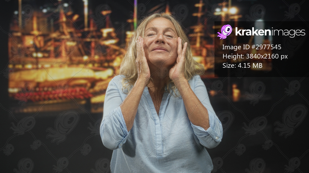 Senior woman clasping hands over chest, smiling with closed eyes in a studio with a lit ship exhibit and warm soft lighting; contentment.