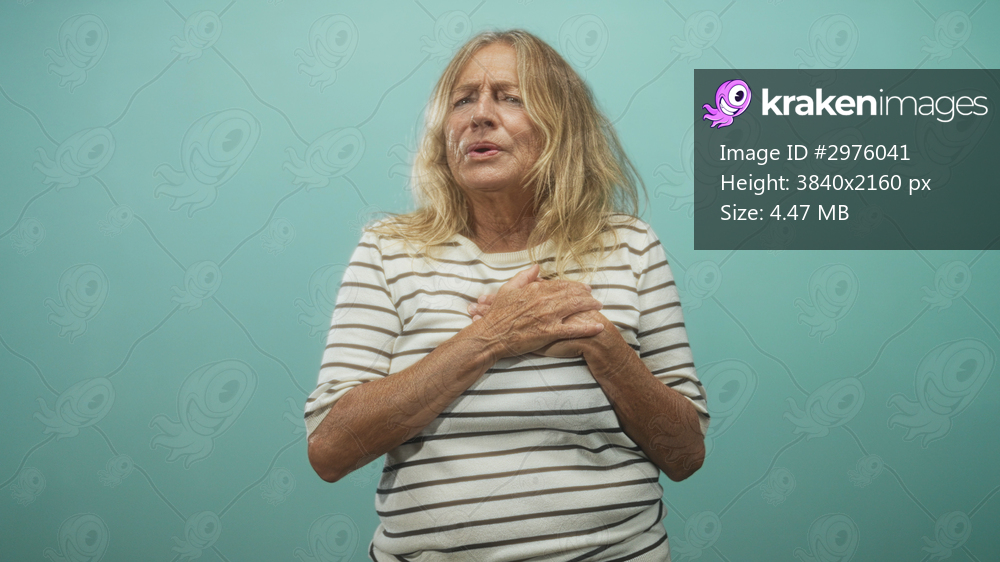 Senior woman clutching chest with both hands, eyes closed and grimacing against a teal studio backdrop, striped shirt visible, possible heartattack; pain. - Kraken Images